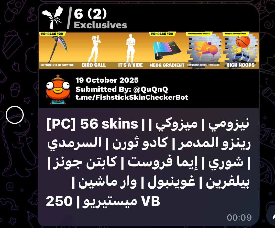 حساب فورت نايت 56 سكن 🔥 و 130 حقيبه ظهر 🔥 + 124 بيكاكس + 63 رقصه 🔥 + 89 مضلات + 16 سكن ذهبي 🔥 الحساب اساسي هوتميل يربط كلشي + يربط سوني ✅. الحساب قوي جدا و سكنات شوب و عرق مليانه 😭 الحساب بدون رقابه ابويه . الحساب ضمان تشغيلي لانه الحساب خامل 18 يوم يعني محد دخله لمده 18 يوم 🔥 . الحساب مأمن و قوي جدا و ينفع شخصي او هديه ل اخوك او خويك بسبب سعره الرخيص 🔥 اعطيك معلومات ( الابك ، الاساسي ) الحساب مطلوب وراح ينباع بسرعه لذلك لحق على الحساب 🫣 لانه قوييييي 💪 الصور تحت ⬇️