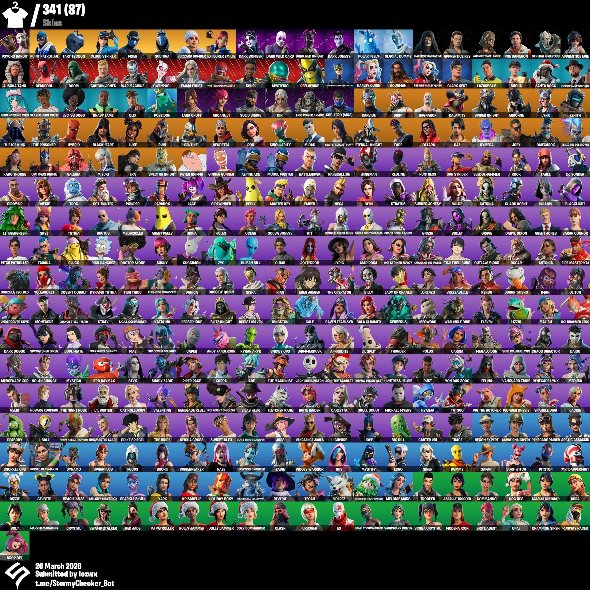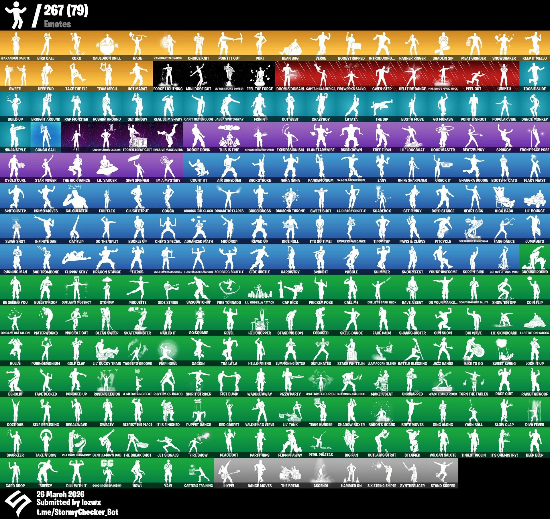 سكيلتون وسيزون 2 وثري وسيزونات كثير وسكنات اتوقع 179 ورقصات مجموعها 700 وحاجه ايميل يتغير وكلشي سليم...