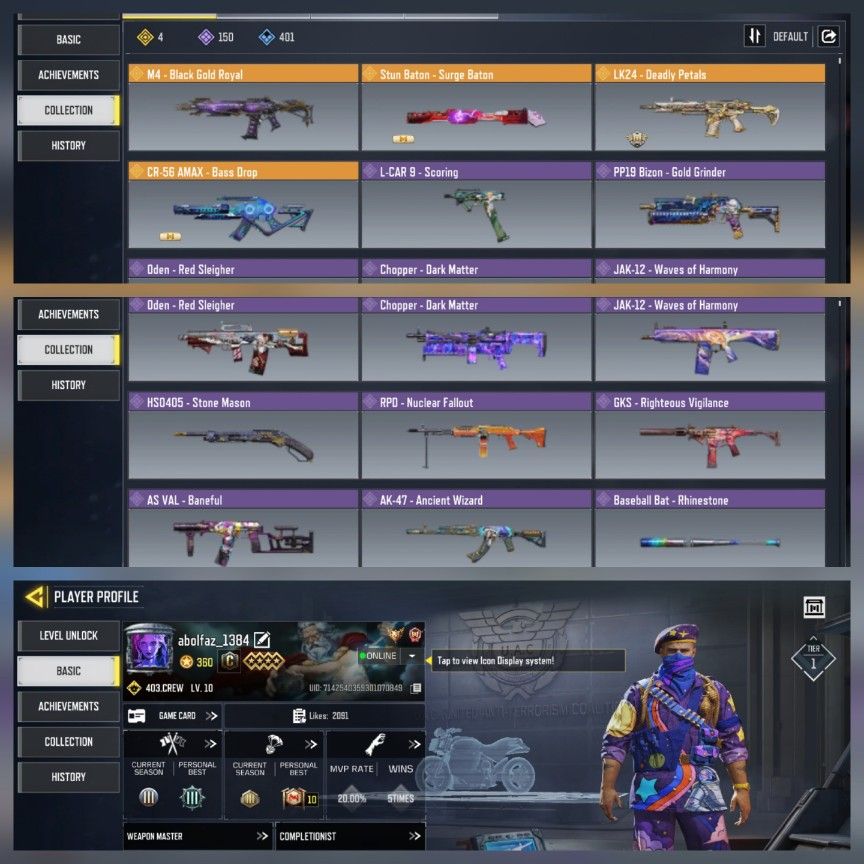 lvl360💥4legend guns 💥150epic guns💥74skin 💥💥💥Global Version