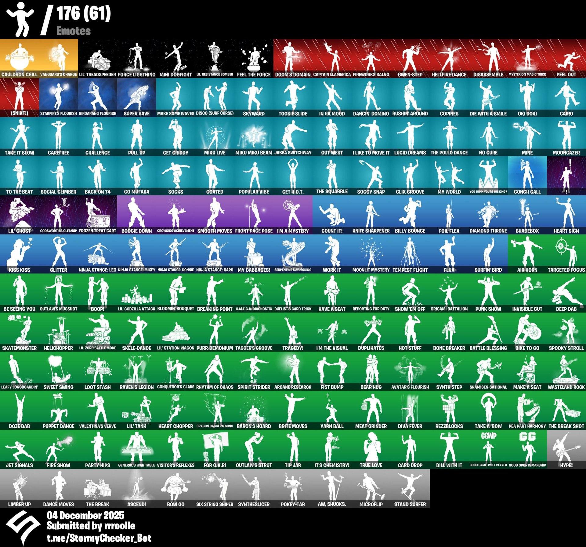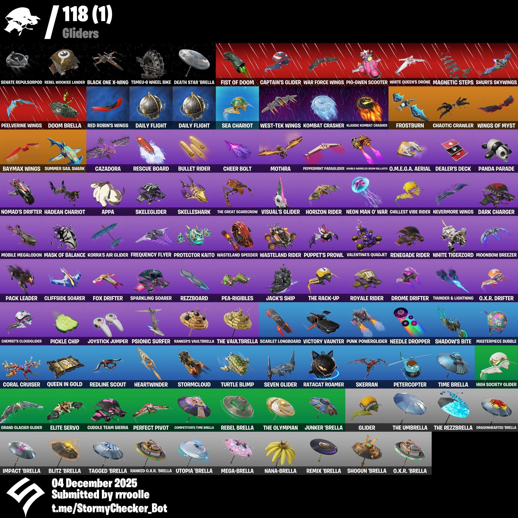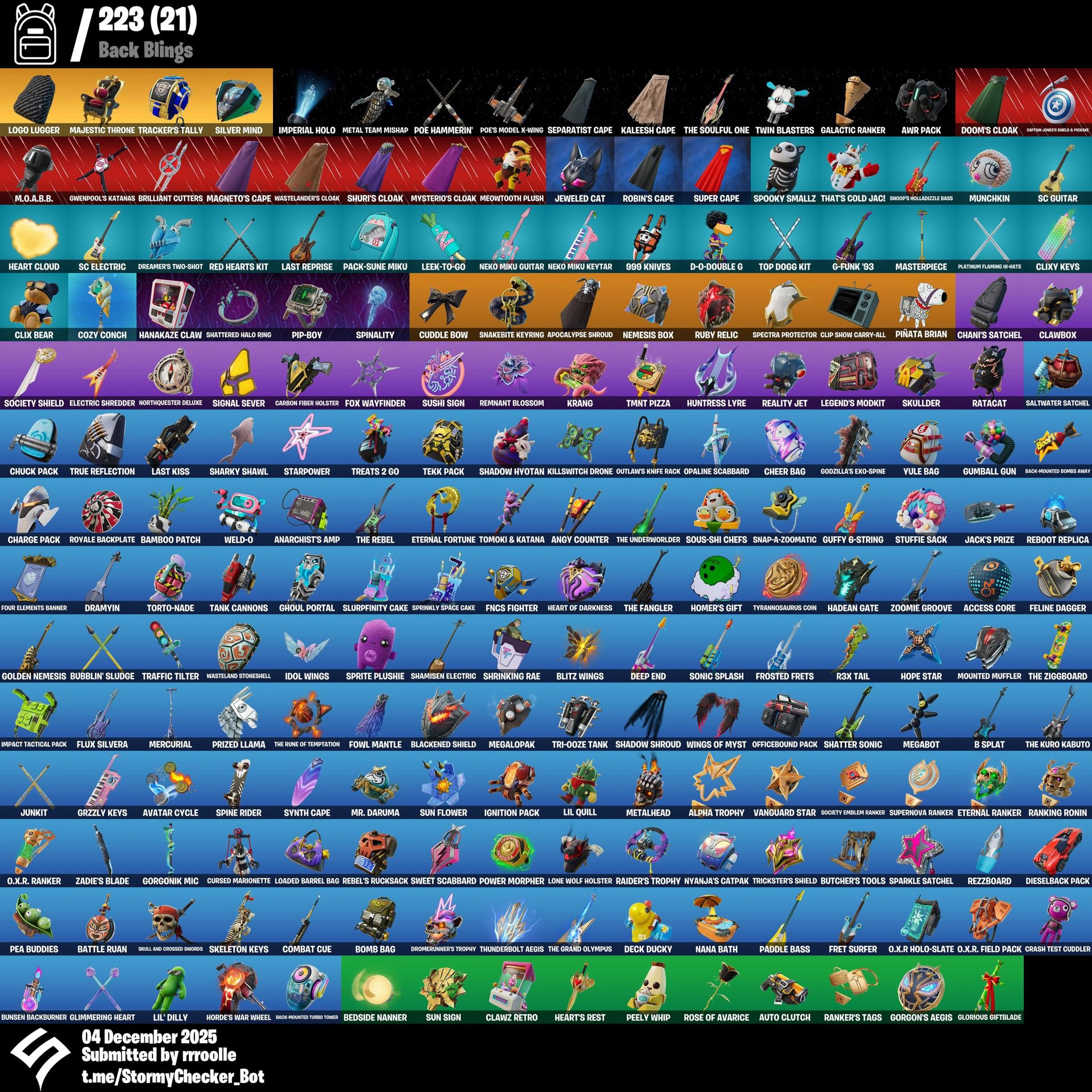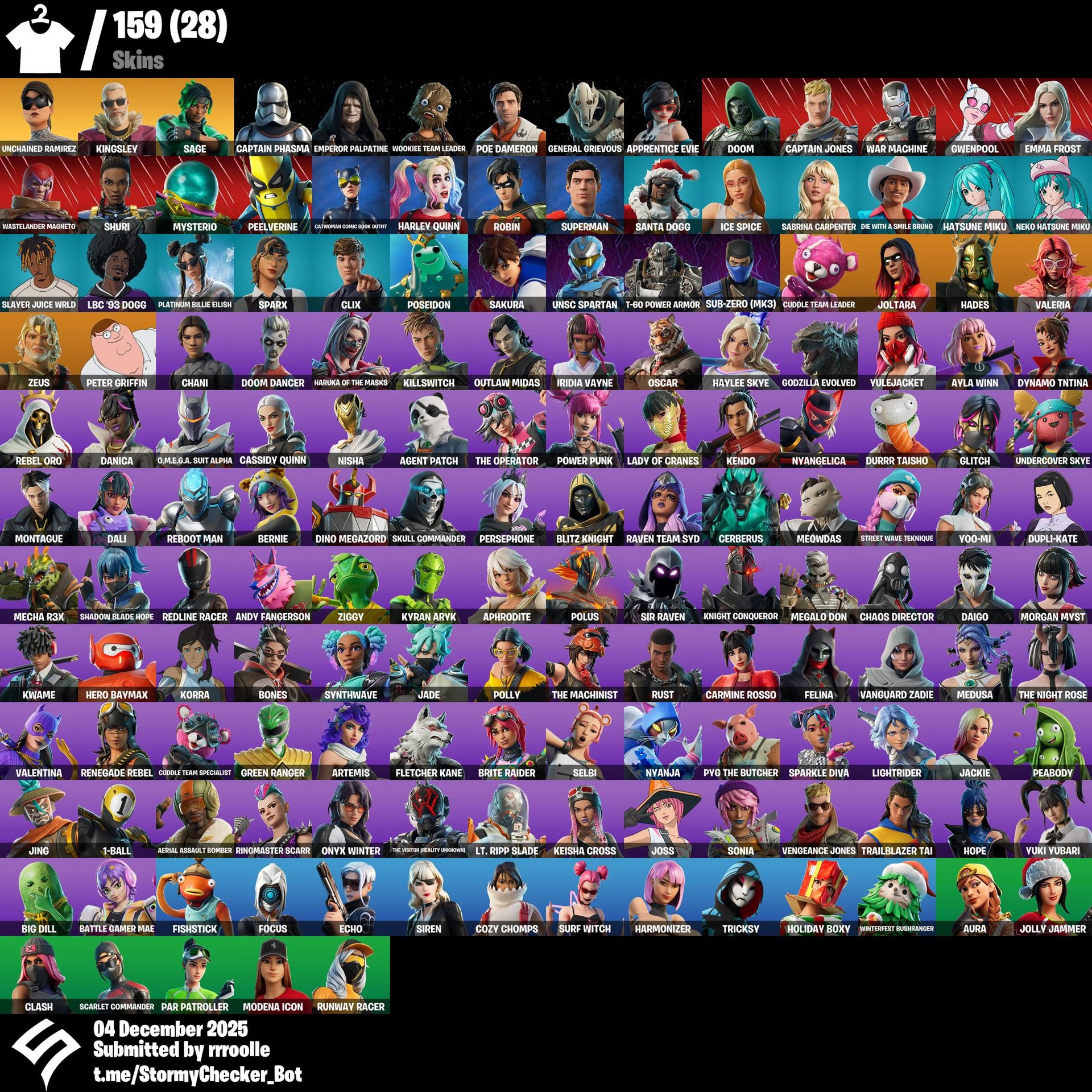الحساب ينربط جميع المنصات وفيه شوز القرش والايميل يتغير ━━━━━━━━━━━ Skins - 159 Back Blings - 223 Pickaxes - 197 Emotes - 210 Gliders - 118 Wraps - 120 Loading Screens - 245 Music Packs - 8 Shoes - 5 Vehicles - 4 Contrails - 68 Sprays - 240 Emoticons - 109