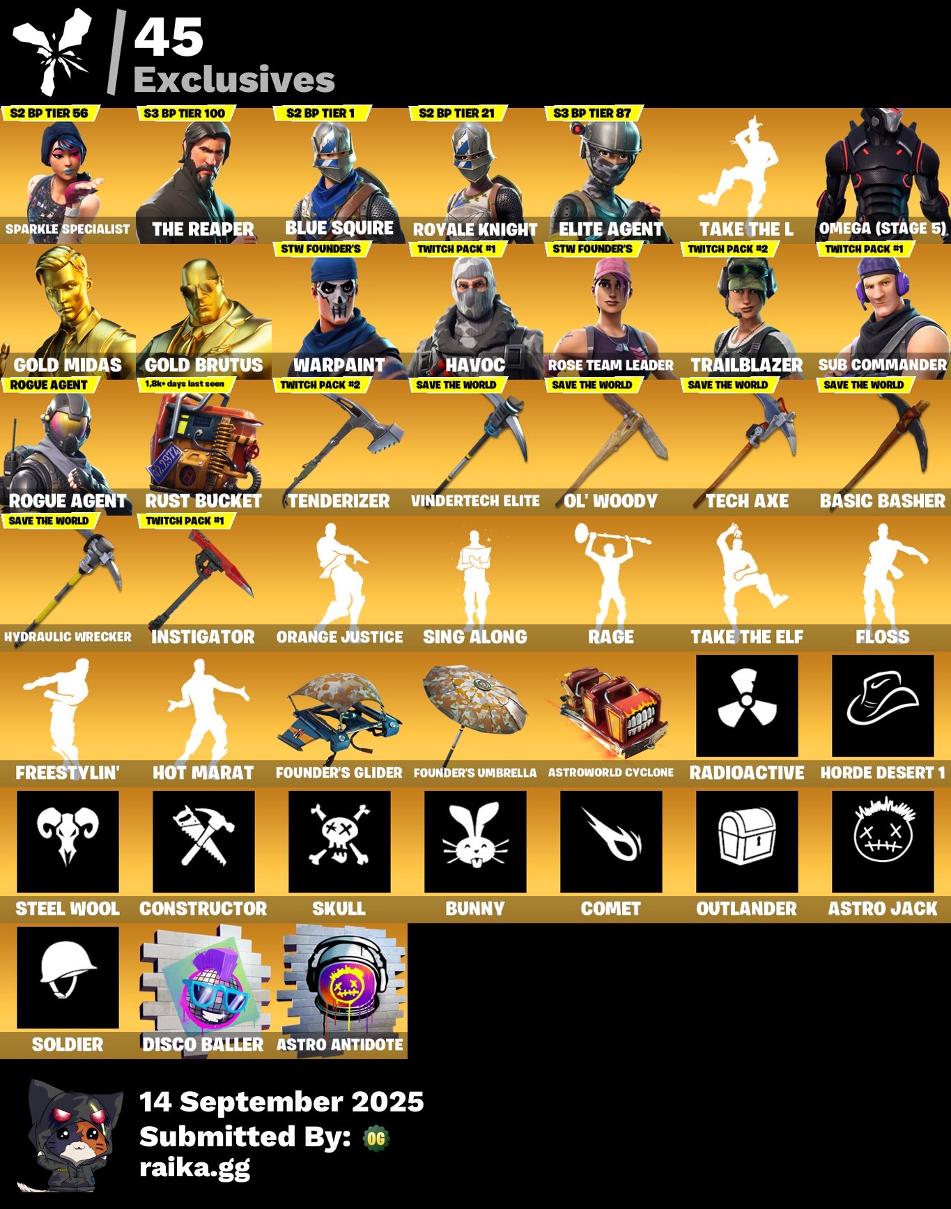 • حساب فورت نايت اساسي • يربط جميع المنصات • سيزن 2 النص • سيزن 3 ماكس • سكن بنت الديسكو • سكنات تويتش النادرة • رقصة FLOSS • طور الزومبي القديم • باقة Limited Edition طور الزومبي 🔥 • 95 سكن • 76 بيكاكس • 77 رقصة • الحساب خامل 253+ يوم • 500 فيبوكس • الحساب ايميلة هوتميل (hotmail) • الحساب مضمون✅ • ايميل الايبك يتغير شهر 11✅