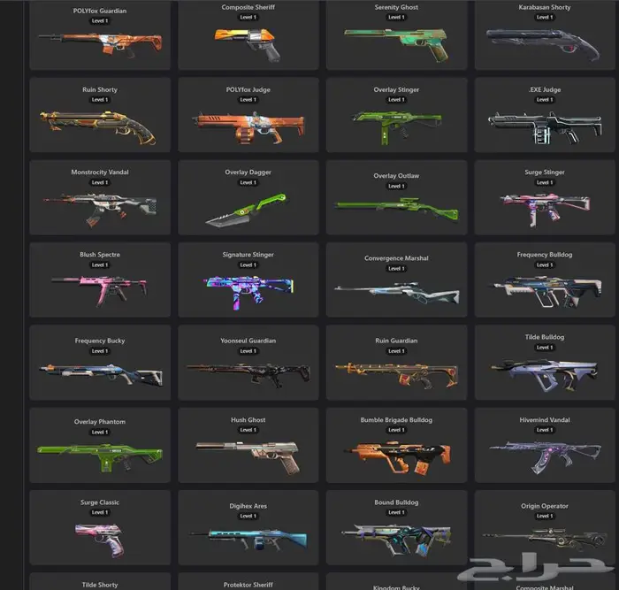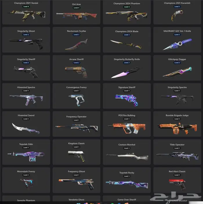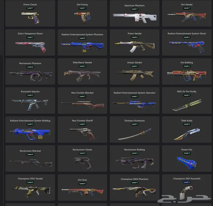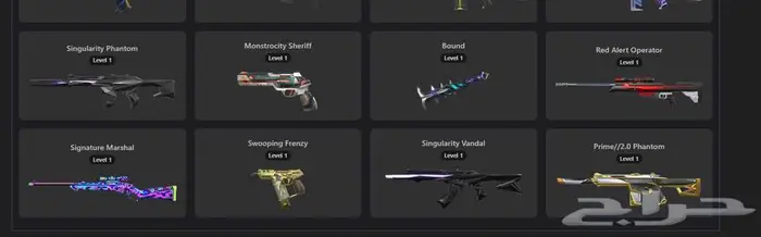 اغلب السكنات المطلوبه موجوده Weapon Skins: Vandal: 14 skins Phantom: 8 skins Knife: 8 skin...