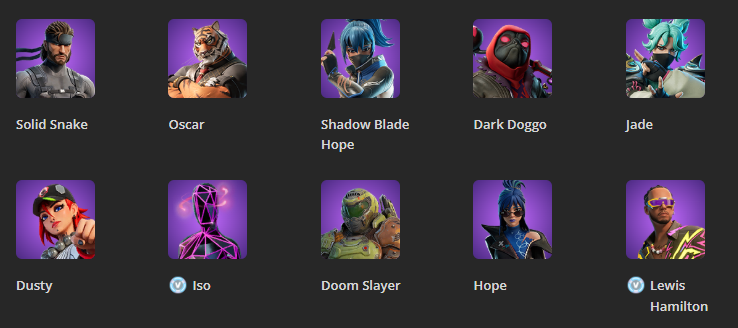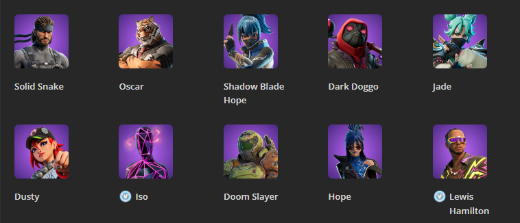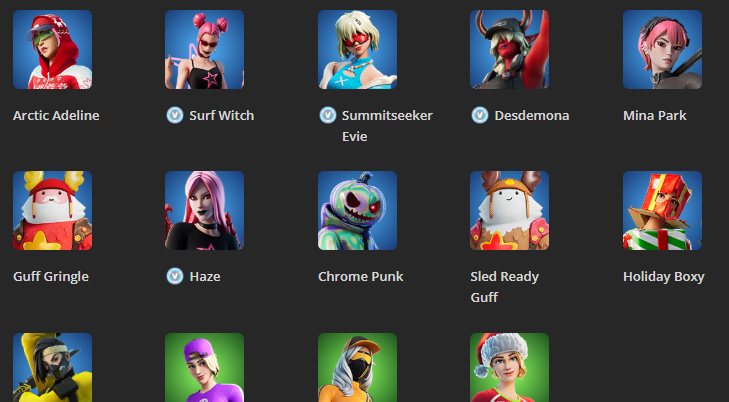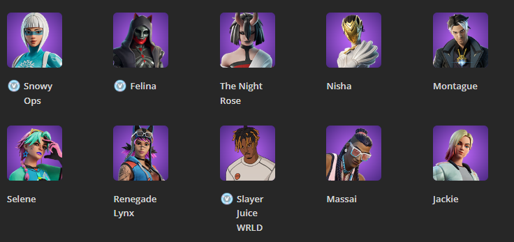حساب فورتنايت فيه 108 سكن من ضمنها لارا كروفت وسكنات السيزون 10 و 9 موضح بالصور كل السكنات و الرقصات...