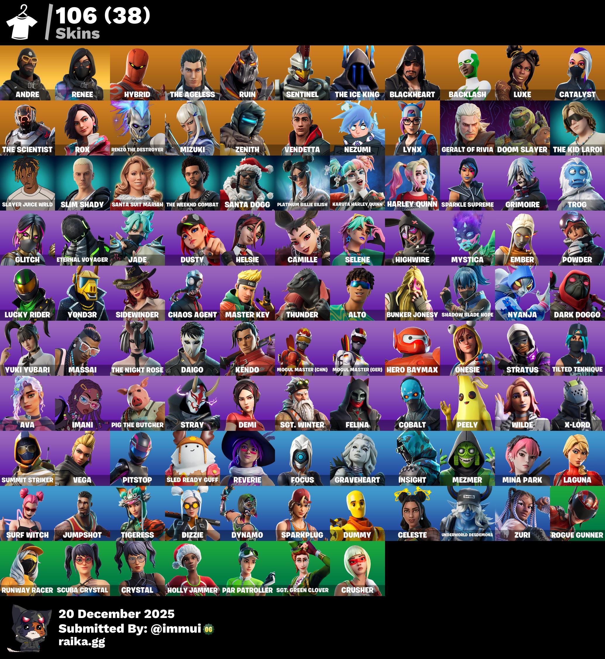 [PC] 106 skins | آندري | رينيه | الهجين | السرمدي | دمار | الحارسة | ملك الجليد | القلب الأسود | باكلاش | الفاخرة | المحفز | العالِم | روكس | 500 VB ضمان مدى اربطه بايميلك فوق 106 سكن بينها نوادر