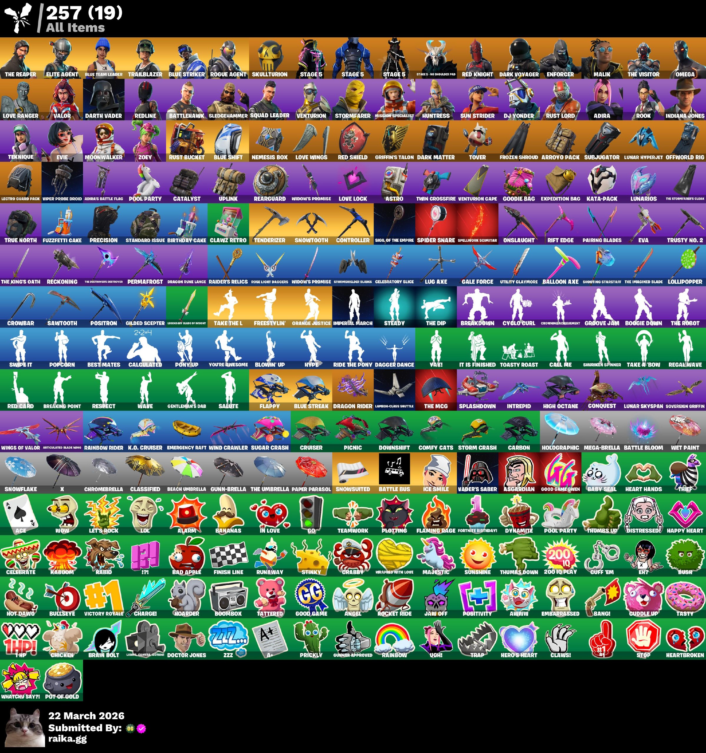 حساب فورت نايت "نظيف" من بدايه اللعبة السيزون الثالث كامل السيزون الرابع كامل ( سكن التويتش برايم النادر جداً ) المظلات القديمة Mako (نادرة) + مظلات الفوز من السيزون 3 و4 و5 إحصائيات الحساب : يحتوي على 257 عنصر متنوع (سكنات، رقصات، فؤوس، حقائب) الحساب ماقد انربط ب رقم + ايميله معه