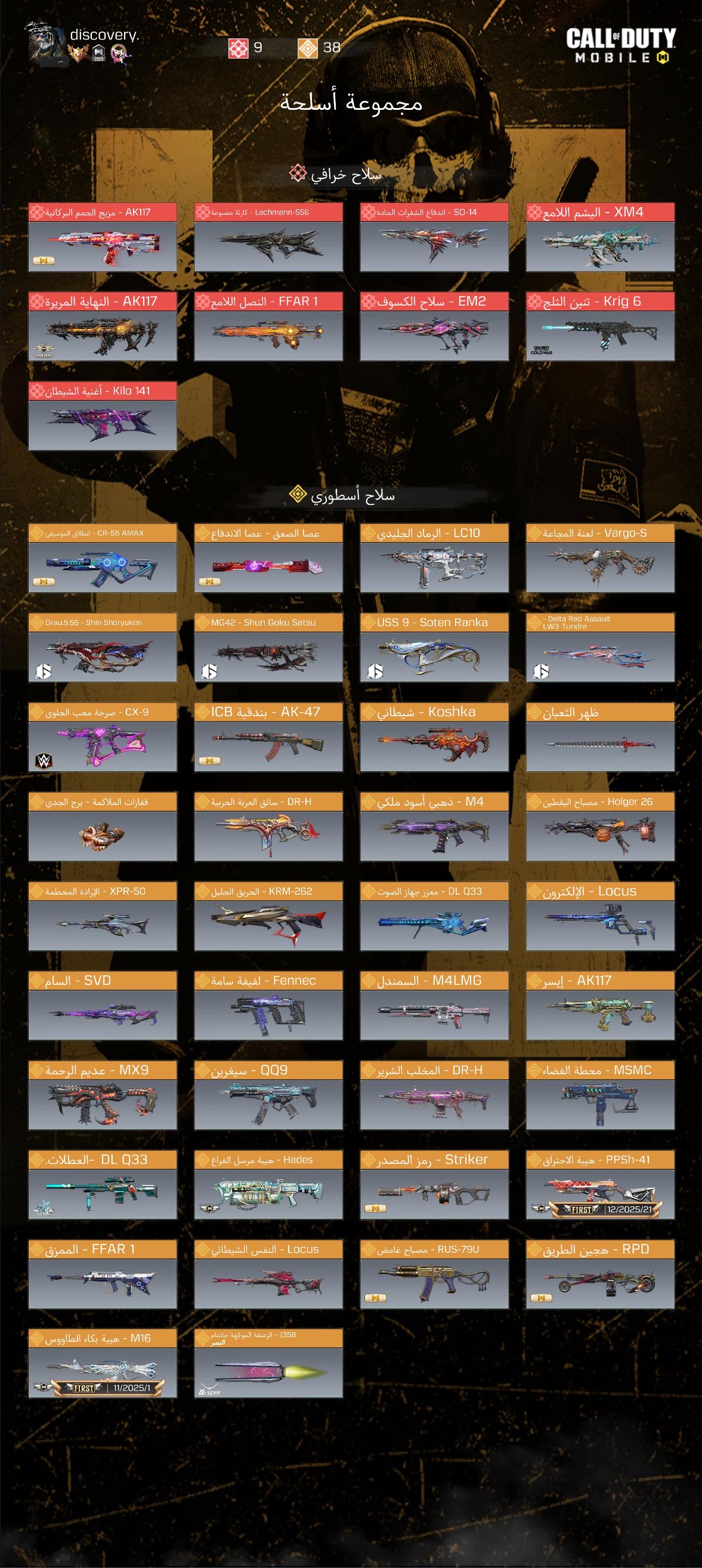 السلام عليكم ورحمة الله وبركاته للبيع حساب كود موبايل لفل الحساب : 400 ايدي الحساب : 6906844419497590785 عدد الاسطوري 🔥 الطور الجماعي : 4 الباتل : 20 الحساب صيدة ويوجد فيه اسلحة اسطورية كثيرة ومن ابزرها : DLQ33 الموسيقي DLQ33 الثلجي Loucs الشيطاني Loucs الالكترون Koshka الشيطاني الربط : اكتفيجين الشات : عربي اول سحبة : 10cp الحساب فاتح فيه الدمشقي وفيه تمويهات الروح الحمراء عددها 44 عدد أسلحة الميثيك : 9 عدد الأسلحة الاسطورية : 38 عدد أسلحة البرستيج : 3 مصنف سلاح PPSH-41 عالمي🔥. ويوجد اسكن كوجي تبع DMZ ويوجد ايضاً سيف كوجي والتومهاك حق كوجي🔥🔥. الحساب كامل والكامل وجه الله ولايحتاج تتعب فيه بشيء الحساب ينفع للمستخدم ، والله يبارك للمشتري❤️.