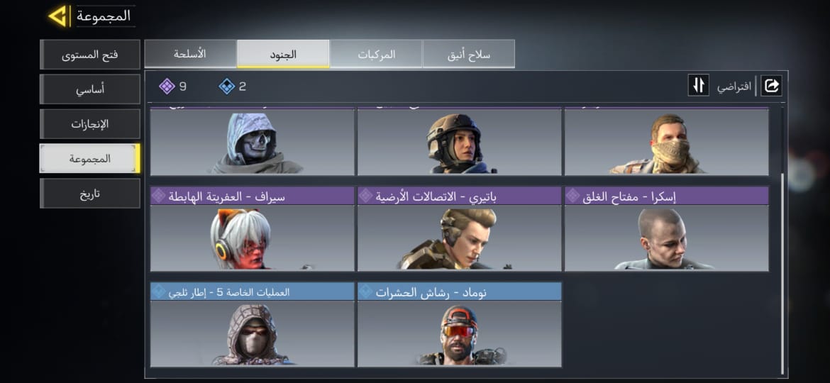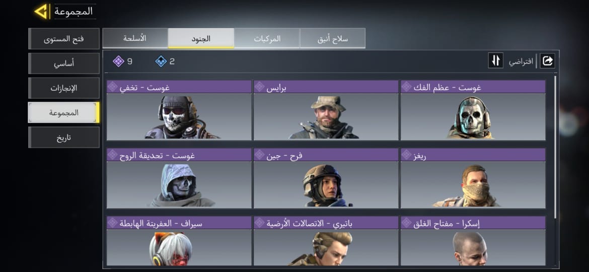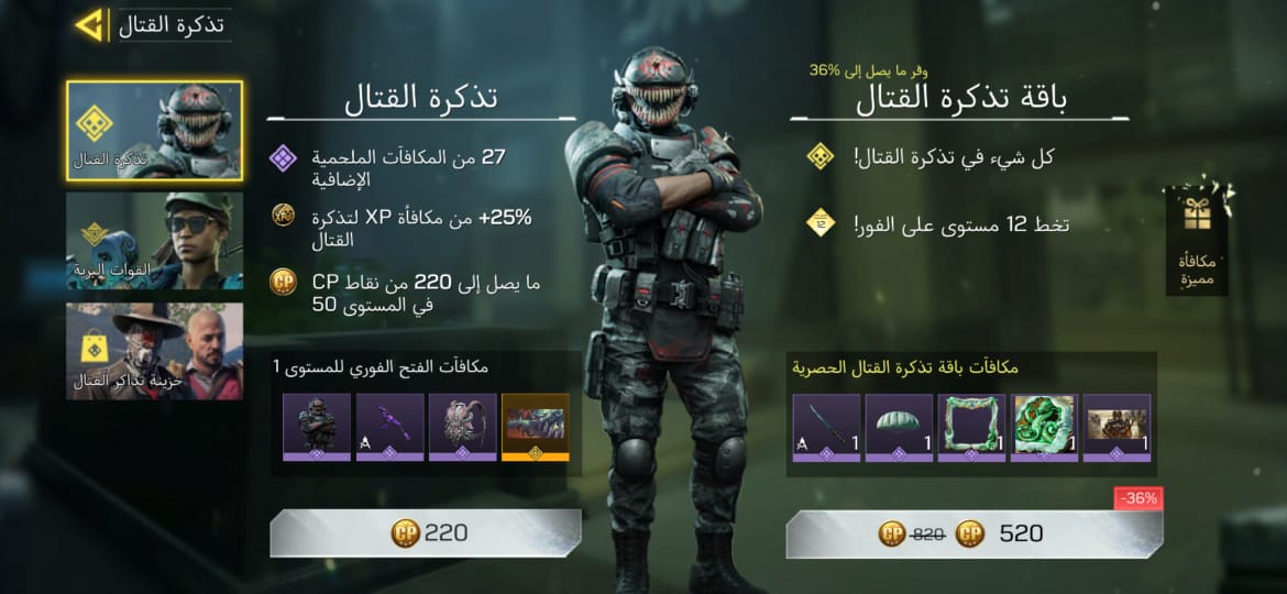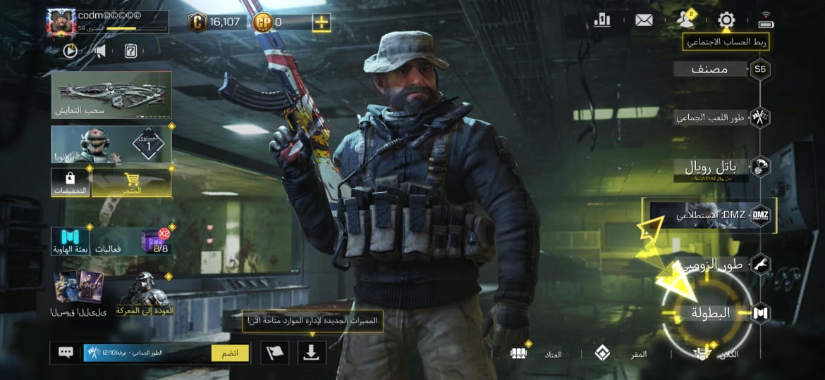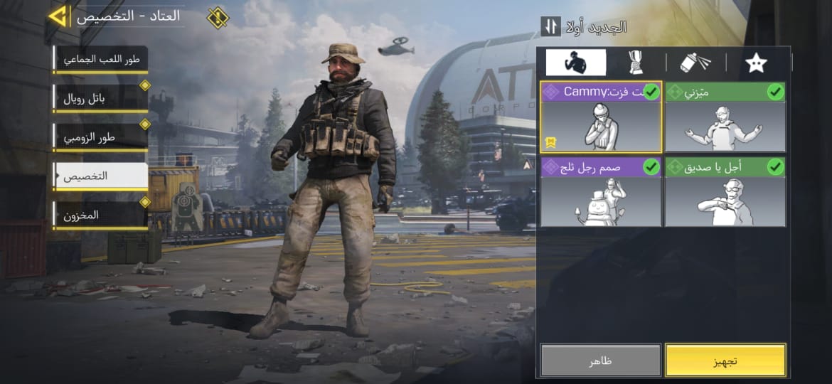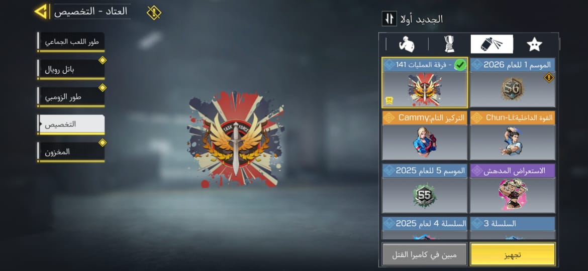 🌍 مميزاته: 💰 العجلة : تبدأ من 10 CP فقط! 🎟️ الباتل باس : بـ 220 CP فقط. 🔴 المحتويات : ⚔️ الأسلحة والشخصيات (موضحة في صور العتاد): 🟡 الأسطوري: سلاح M4 - الملكي. 👤 النوادر: كابتن برايس الأصلي + طقم فرقة 141 (سلاح AK-47 والقنبلة اللاصقة والملصق الخاص). 💀 الشخصيات: (غوست عظم الفك وتحديقة الروح، سيراف، والعديد من الشخصيات الملحمية). 🟣 الأسلحة الملحمية: 8 أسلحة Epic قوية ونادرة. 🕺 الرقصات: تشكيلة ممتعة تشمل رقصة (Cammy) ✅ حالة الحساب والارتباط: الارتباط: أكتيفجن (يتم تسليمك الإيميل الأساسي وكامل معلومات الحساب