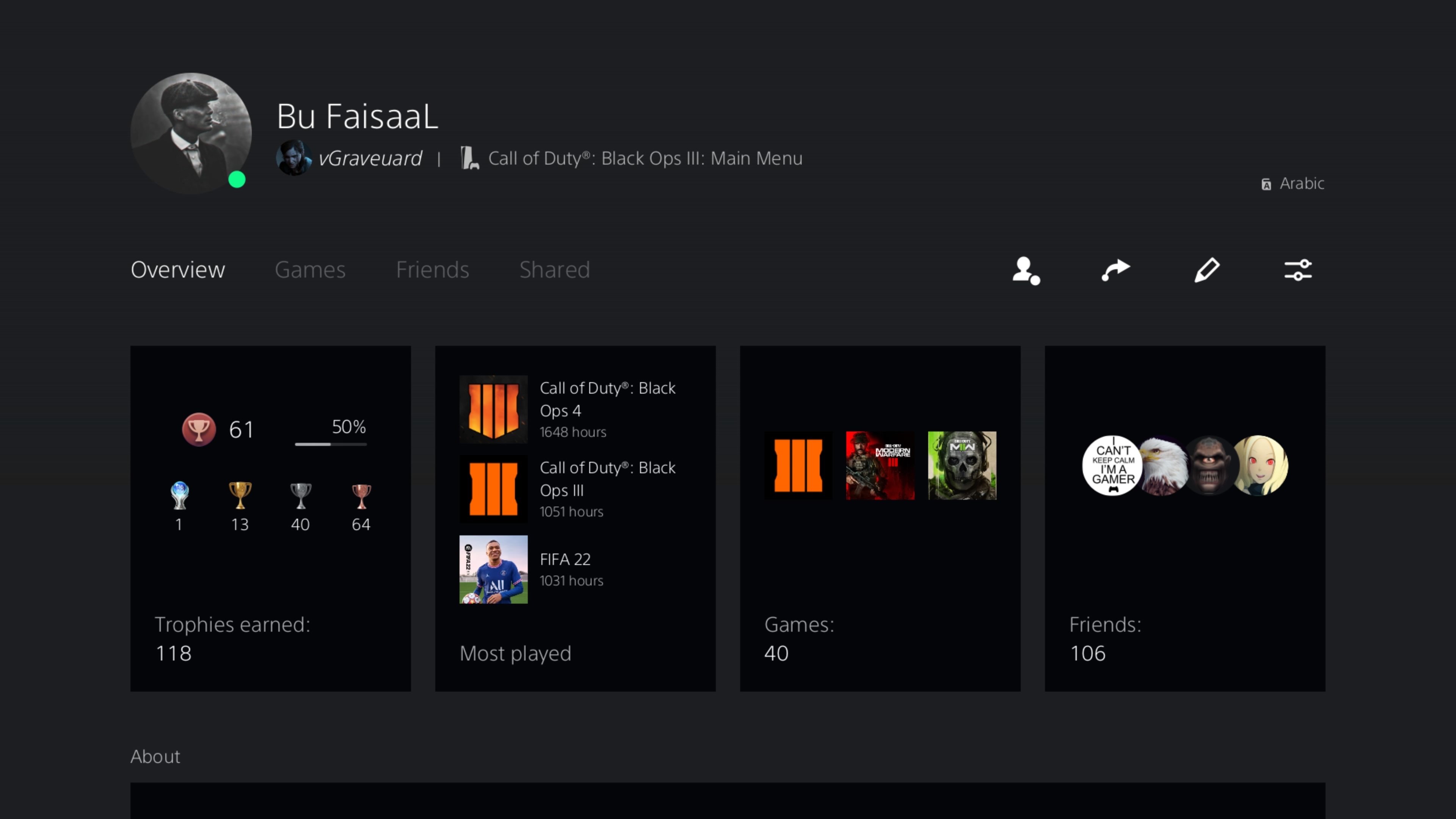 مواصفات الحساب في العاب كود : Black Ops 3 : ملتي بلاير و زومبي لفل 1000 ماكس ، مهكر اقوى تهكيره فاللعبه كلاسات و اسلحه و سكنات ، فلوس وعلك لا نهائيه فالزومبي ، 400000 الف ليكويد ديفينيوم كل شي ماكس Black Ops 4 : لاعب فوق ال 1700 ساعه و مسوي فرش ريستارت مع الكولنق كارد ، حساب قوي و سمعته قويه ايام البطولات و وتحديات نافس ، فيه امبلمات جداً نادره Black Ops Cold War : موصل لفل 1196 Modern Warfare 1 : موصل ماكس لفل 1000 + فاتح تروفي البلاتينيوم Vangard : موصل ماكس لفل 1000 Modern Warfare 2 : موصل لفل 233 ، رانك كرمسون و دايموند سيزن 3 و 4 و 5 ، سكنات و صور الكرمسون معاه Modern Warfare 3 : تلفيل قليل + معلوب فيه رانك سميرف Rocket League : موصل رانك قراند تشامبيون مع التايتل الحساب ضمان مدى الحياه و مع كامل معلوماته من الألف للياء ، ومعاه حساب اكتفجن و ايبك قيمز ينربطون على جميع المنصات