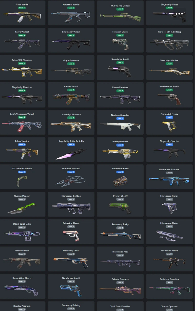 كل السكنات بالصور ⭐ Featured Premium Skins: • Prime Vandal • Reaver Vandal • Kuronami Vandal • Gaia’s Vengeance Vandal • Singularity Vandal • Arcane Vandal • Reaver Phantom • Prime 2.0 Phantom • Sovereign Phantom • Singularity Phantom • Origin Operator • Celestia Operator • RGX 11z Pro Outlaw • Kuronami no Yaiba Melee • Singularity Butterfly Knife • RGX 11z Pro Karambit • Overlay Dagger • Prime Spectre