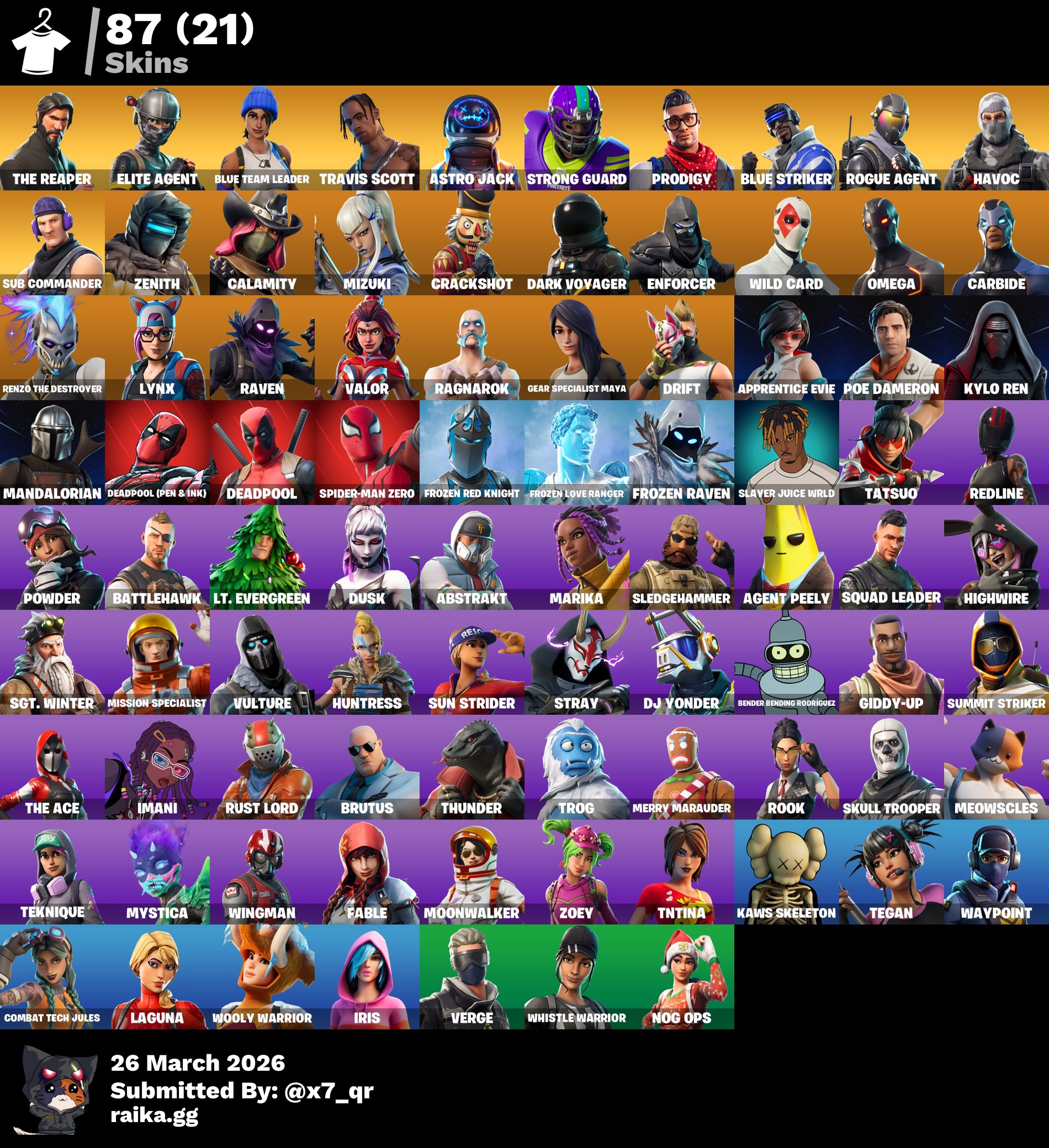 الحساب مع كامل معلوماته واساسي يمديك تغير الايميل لكن تنتظر 14 يوم الحساب فيه 87 سكن وفيه 84 رقصه والاكسات79 الاشياء النادره بالحساب : سكن ترافيس سكوت المحذوف و سيزون 3 كامل تنويه في حال شريت الحساب غير الباس ونتظر لين يمديك تغير ايميله وتخليه اساسي